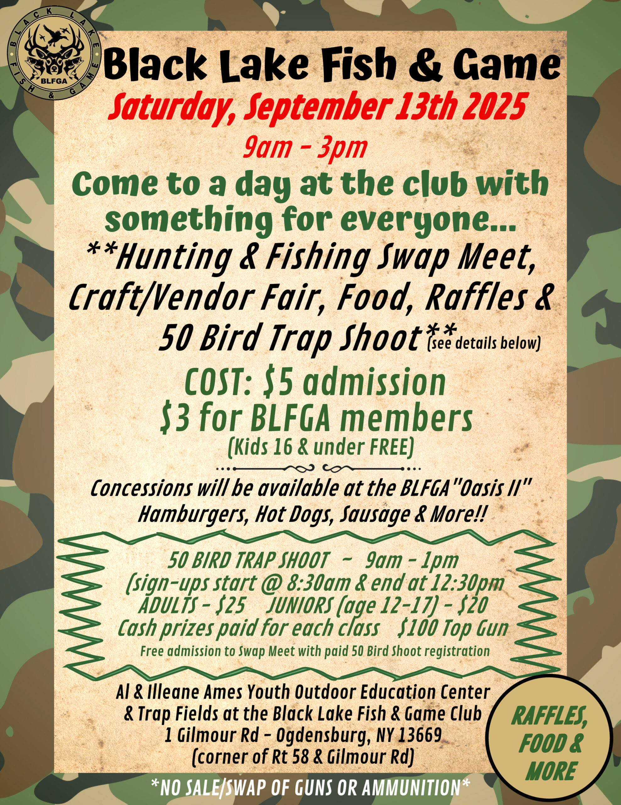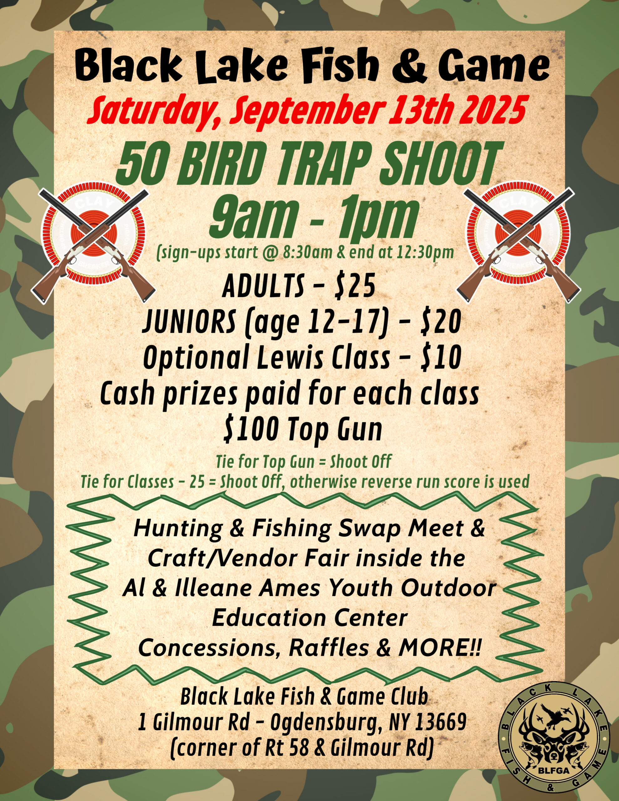 50 Bird Trap Shoot @ the BLFGA Date: Saturday, September 13, 2025 Time: 9:00 AM - 1:00 PM (last sign up @ 12:30pm) Location: Black Lake Fish & Game Association, Inc.1 Gilmour Rd., Ogdensburg, NY 13669 (corner of State Route 58 & Gilmour Rd) Cost: Adults $25 Juniors (age 12-17) $20 Optional Lewis Class $10 Prizes: Cash Prizes paid for each …