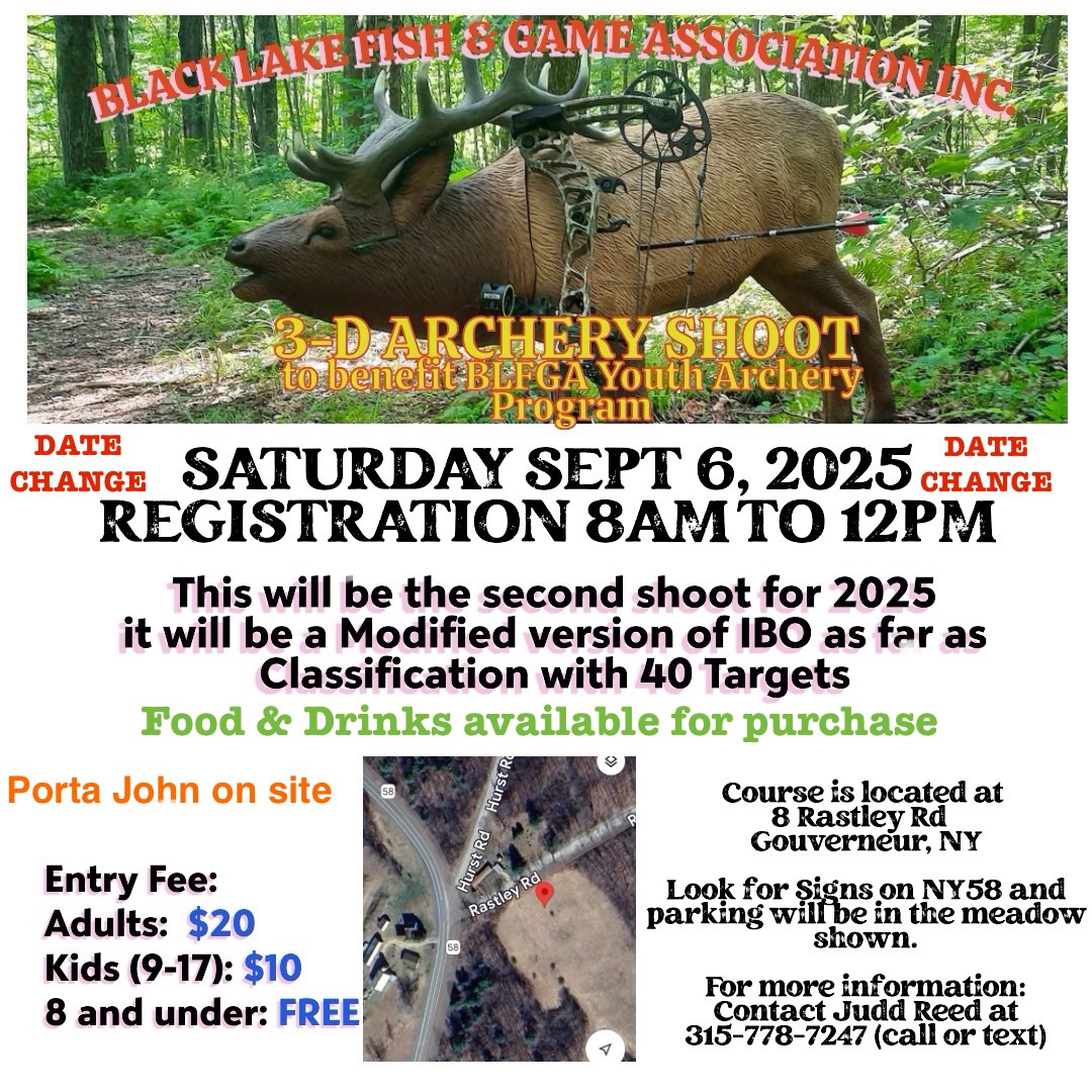 Black Lake Fish & Game Assoc., Inc. 3-D Archery Shoot to benefit our Youth Archery Program!! Saturday, September 6thRegistration 8am - 12pm Modified version of IBO for classifications30+ TargetsCash prizes for top in each class Entry Fee:Adults - $20Kids (9-17) - $108 and under are FREE Enjoy a day of 3D archery, 50/50 raffle & …